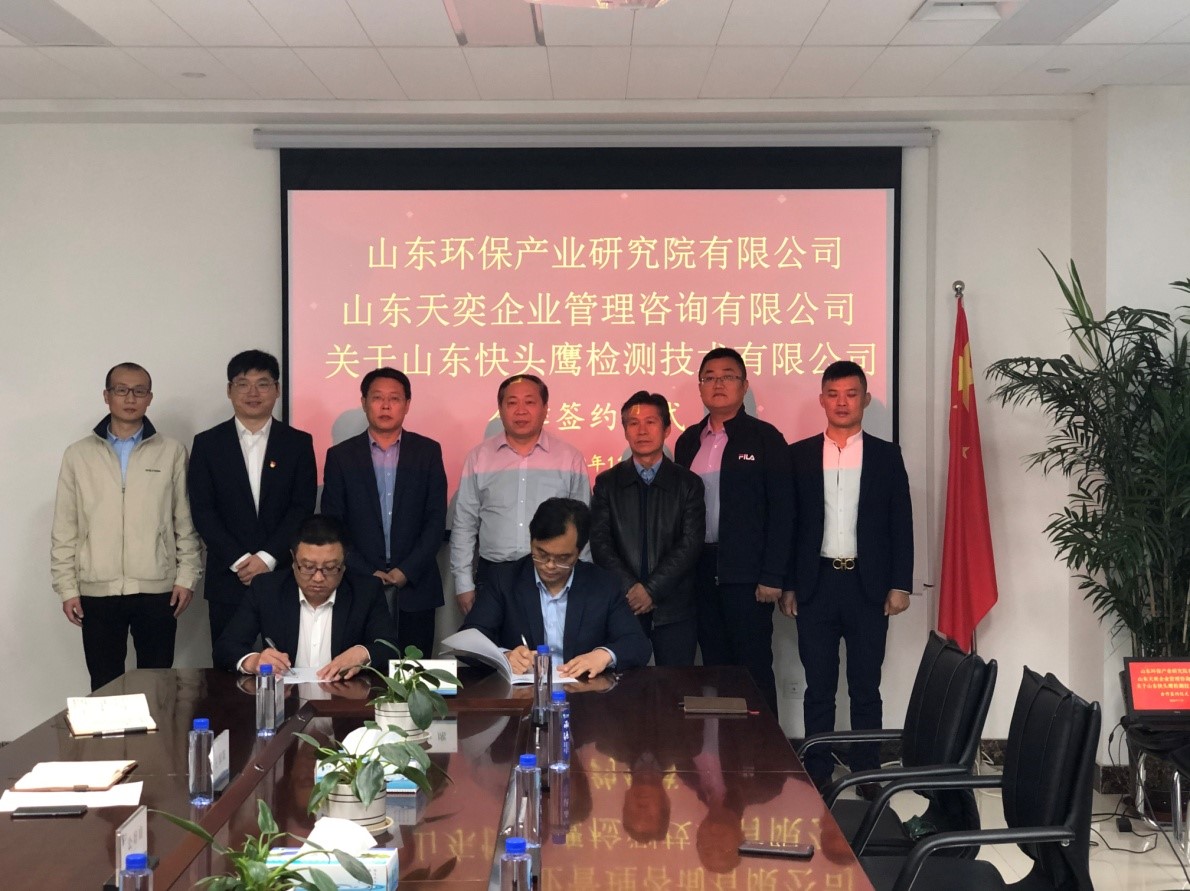 11月21日,山東環保產業研究院并購山東快頭鷹檢測技術有限公司舉行簽約儀式。水發集團環保事業部總經理楊嘉春、水發生態集團公司董事長公培山出席簽約儀式。