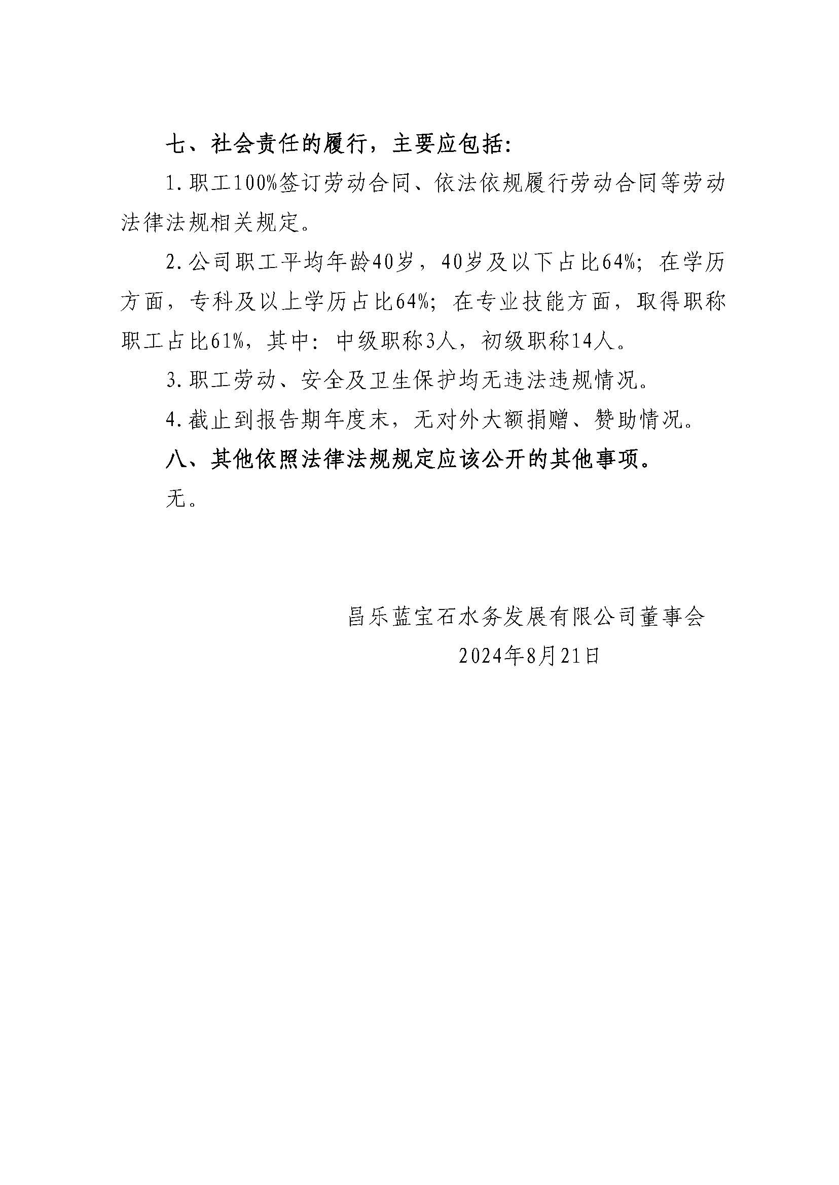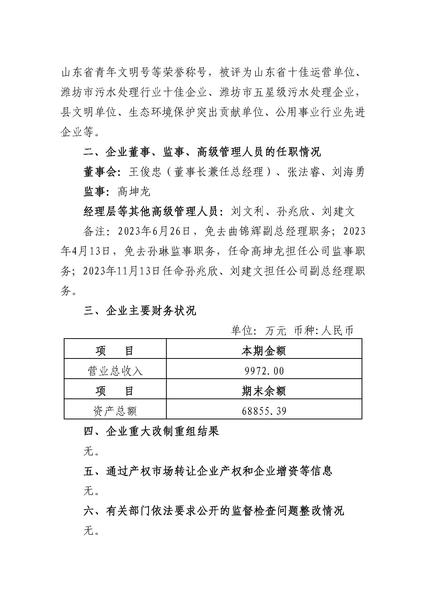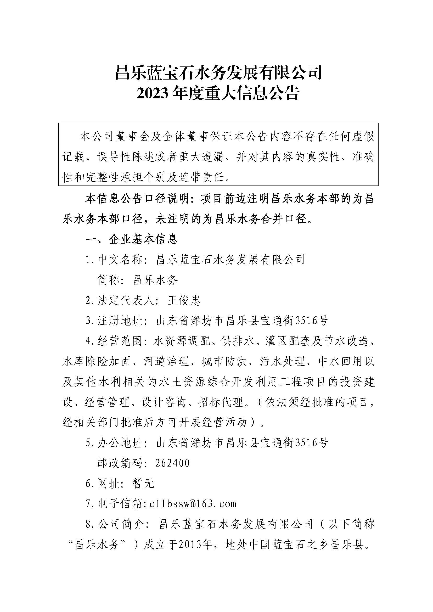 昌樂藍寶石水務發展有限公司2023年度重大信息公告