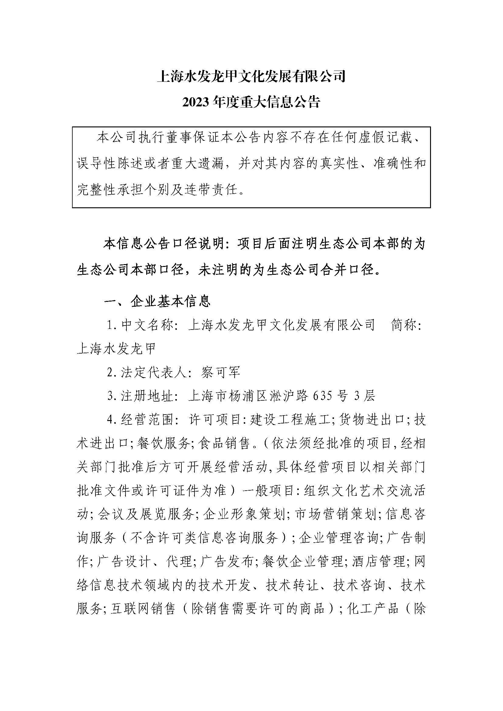 上海水發龍甲文化發展有限公司 2023年度重大信息公告