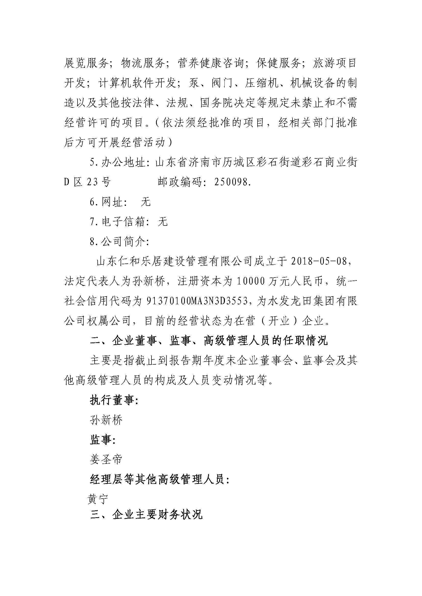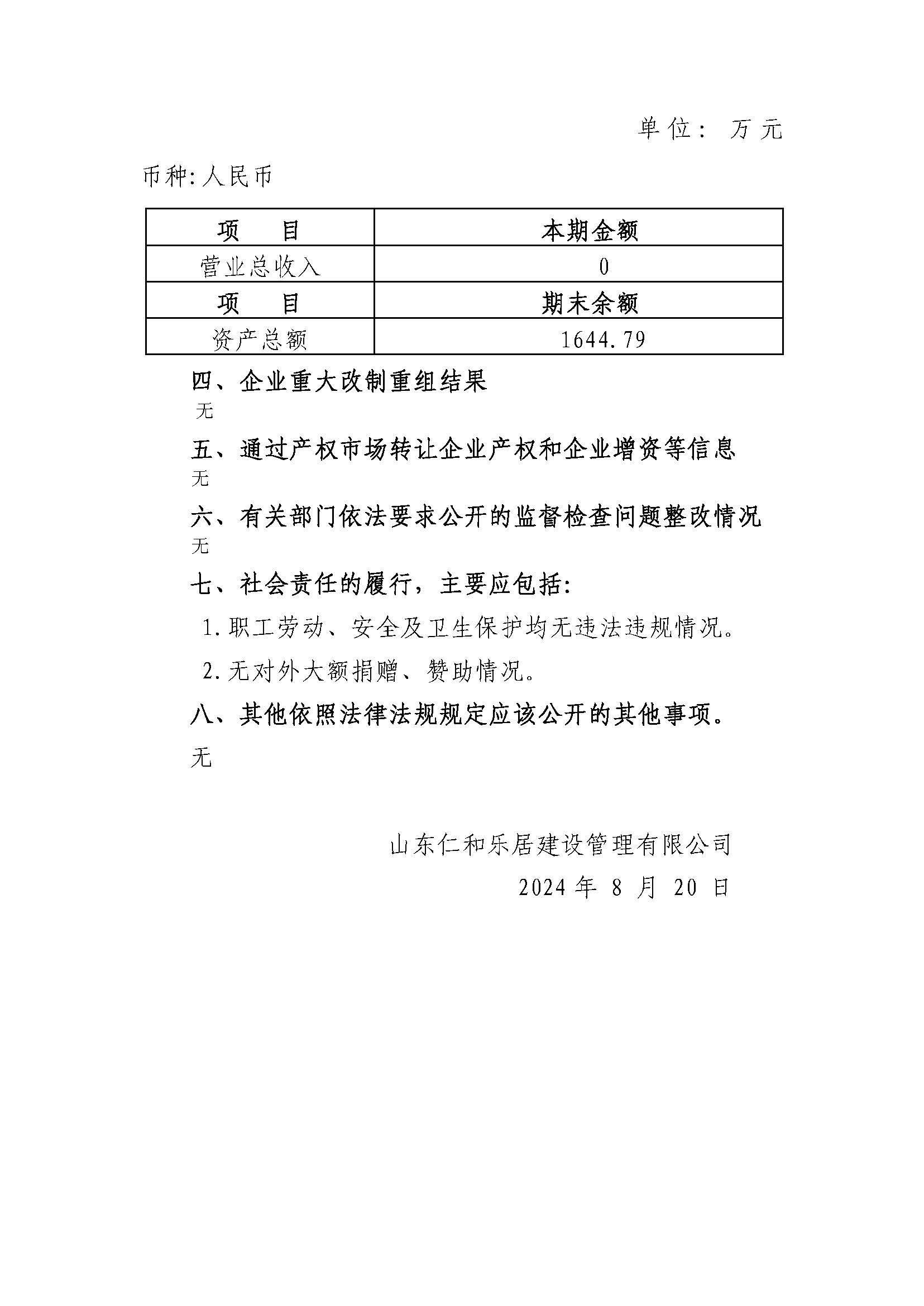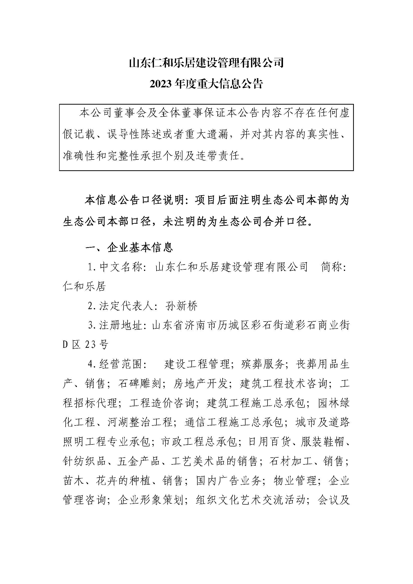 山東仁和樂居建設管理有限公司2023年度重大信息公告