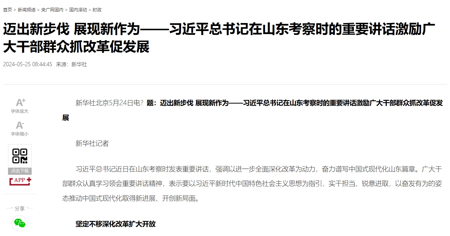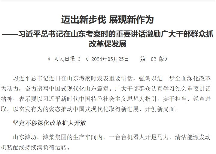 新華社北京5月24日電?題:邁出新步伐 展現新作為——習近平總書記在山東考察時的重要講話激勵廣大干部群眾抓改革促發展