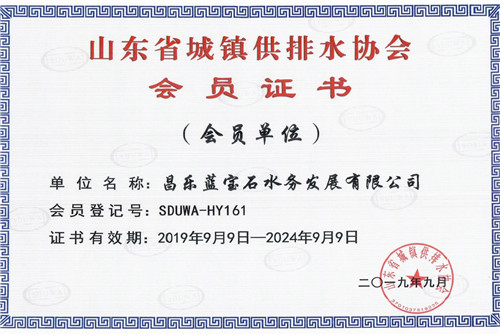 近日,昌樂藍(lán)寶石水務(wù)發(fā)展有限公司榮獲山東省城鎮(zhèn)供排水協(xié)會(huì)頒發(fā)的會(huì)員證書,正式成為協(xié)會(huì)一員。標(biāo)志著藍(lán)寶石水務(wù)公司在探索與同行交流的步伐上邁出了堅(jiān)實(shí)的一步,步入一個(gè)新的臺(tái)階,這是對(duì)昌樂藍(lán)寶石水務(wù)發(fā)展有限公司在水處理行業(yè)工作中的肯定與支持,也是對(duì)公司全體工作人員未來的鼓勵(lì)。