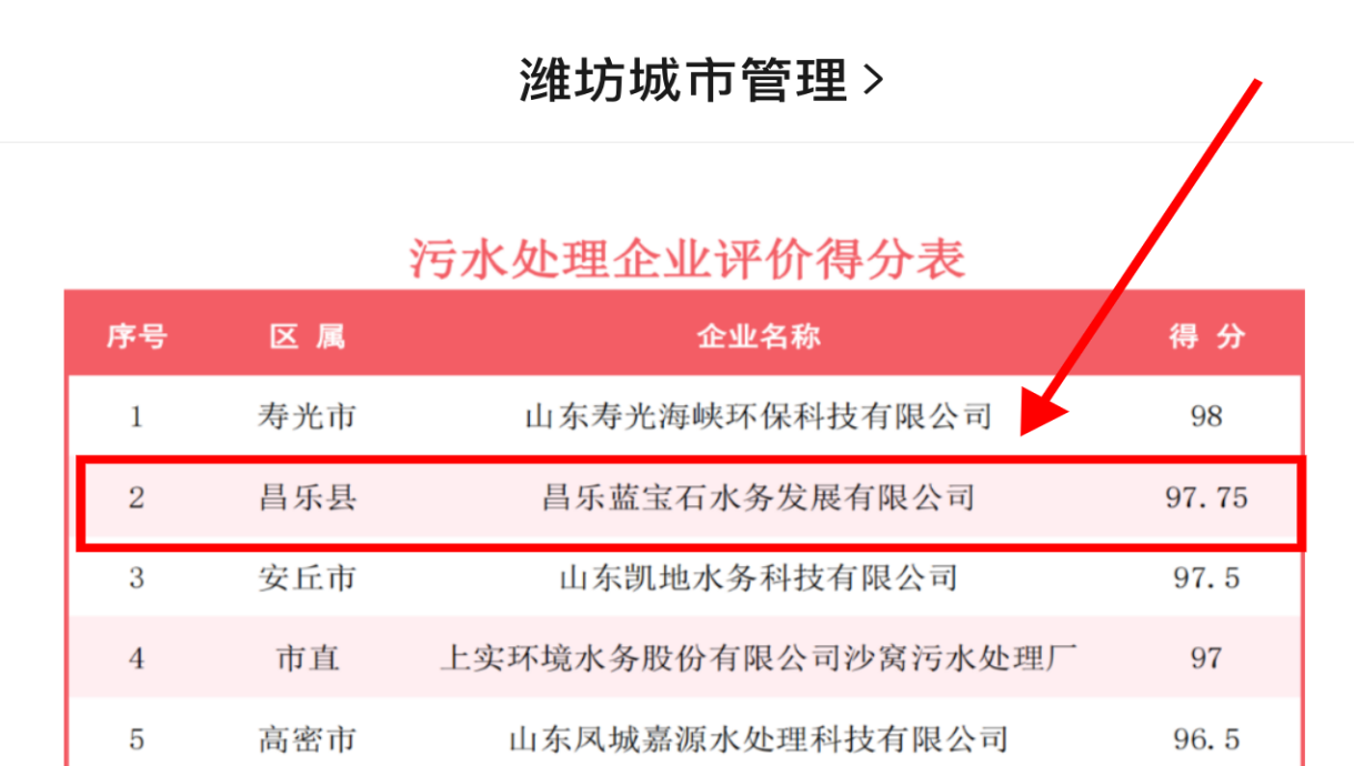 2024年1月上中旬,濰坊市城市管理局組織對全市供水、燃氣、供熱和污水處理等4大類121家市政公用企業(yè)進行了2023年度運行服務質(zhì)量評價,昌樂水務以97.75分位居第二名,并獲得優(yōu)秀企業(yè)風采展示的殊榮。