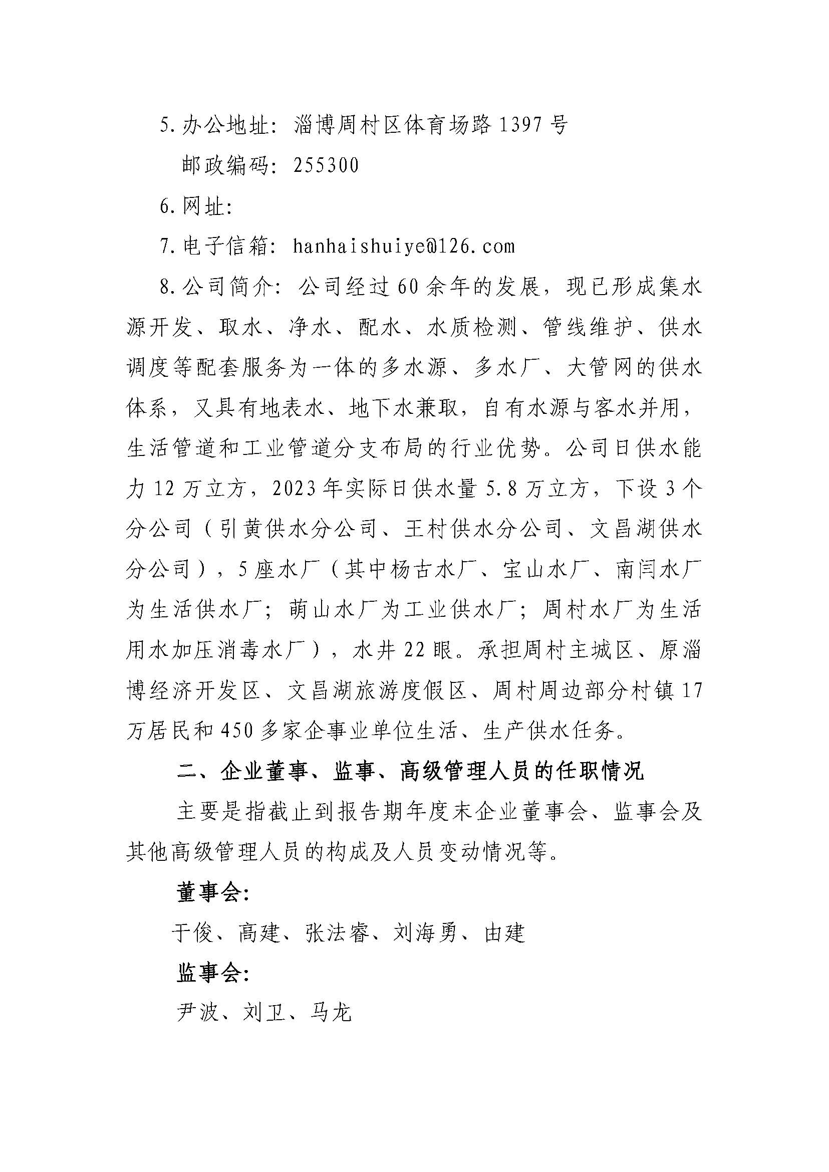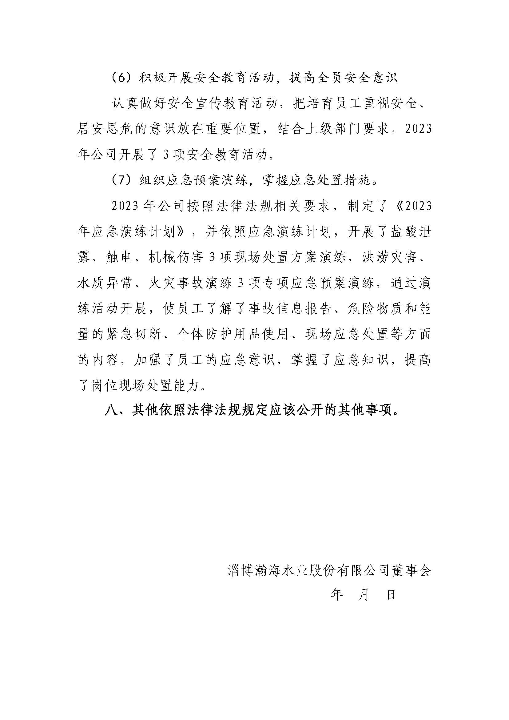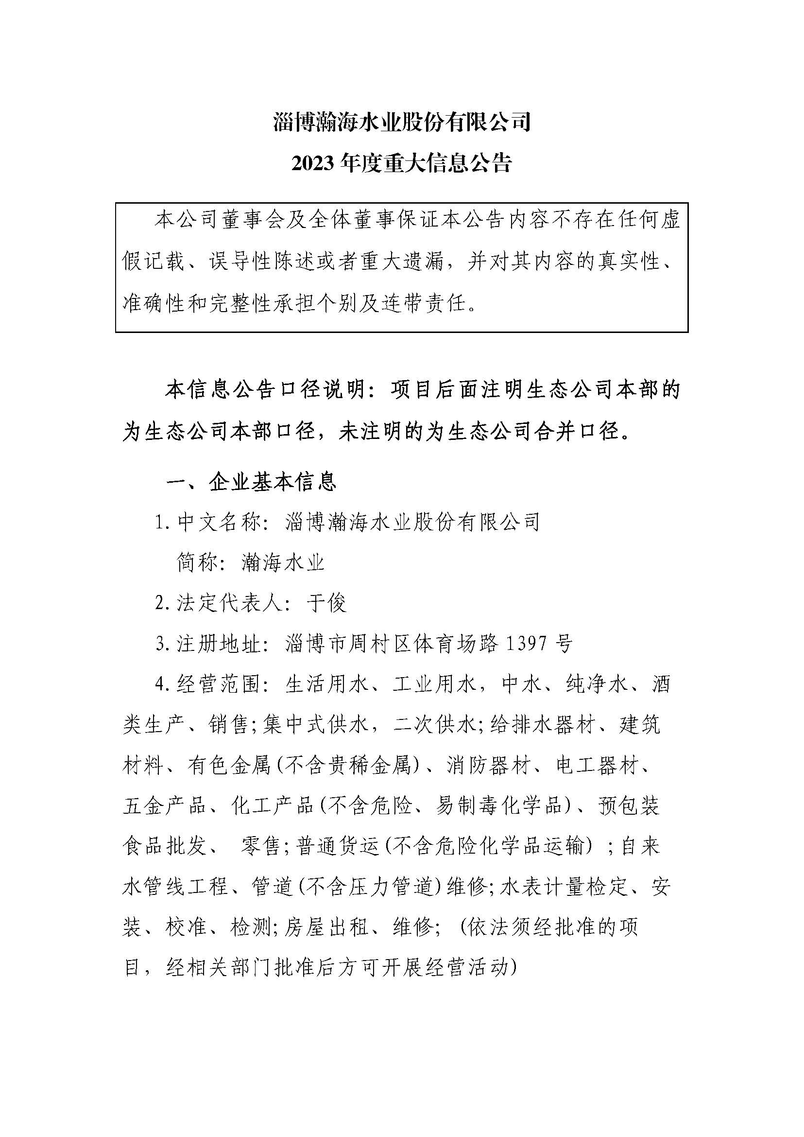 淄博瀚海水業股份有限公司2023年度重大信息公告