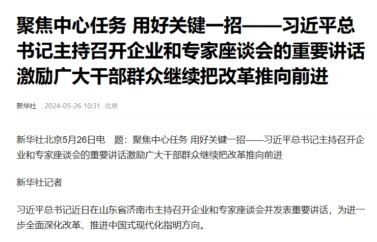 新華社北京5月26日電 題:聚焦中心任務 用好關鍵一招——習近平總書記主持召開企業和專家座談會的重要講話激勵廣大干部群眾繼續把改革推向前進