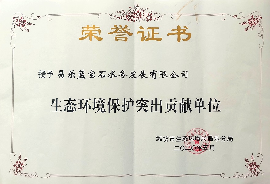 近日,昌樂水務公司榮獲昌樂縣“生態環境保護突出貢獻單位”榮譽稱號。